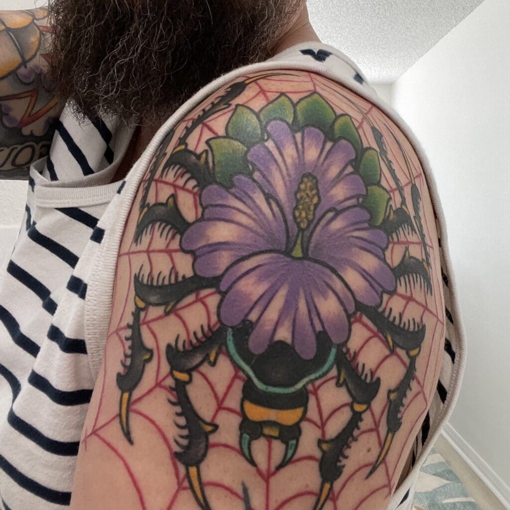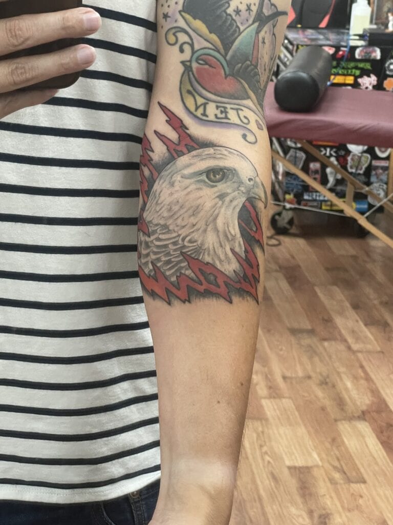 I reserved my right arm for my family. I added Ian next since Jen and Piper were already represented there. Ian loves the hibiscus flower and spiders. I planned to get a large flower with a small spider suspended from it. Once I started talking to Greg, he reminded me of the trad classic “spider with a rose body.” He suggested a spider with a hibiscus body design sitting on a web. Next, I added Gavin. His name means “white hawk of battle,” so a white hawk head was added to my forearm to represent him. Owen was the final large piece. His name, meaning “young warrior,” had me thinking of a sword, so Greg designed a custom traditional sword running down the back of my arm behind the yellow rose. Veritas on my inner bicep and some filler completed the right sleeve.