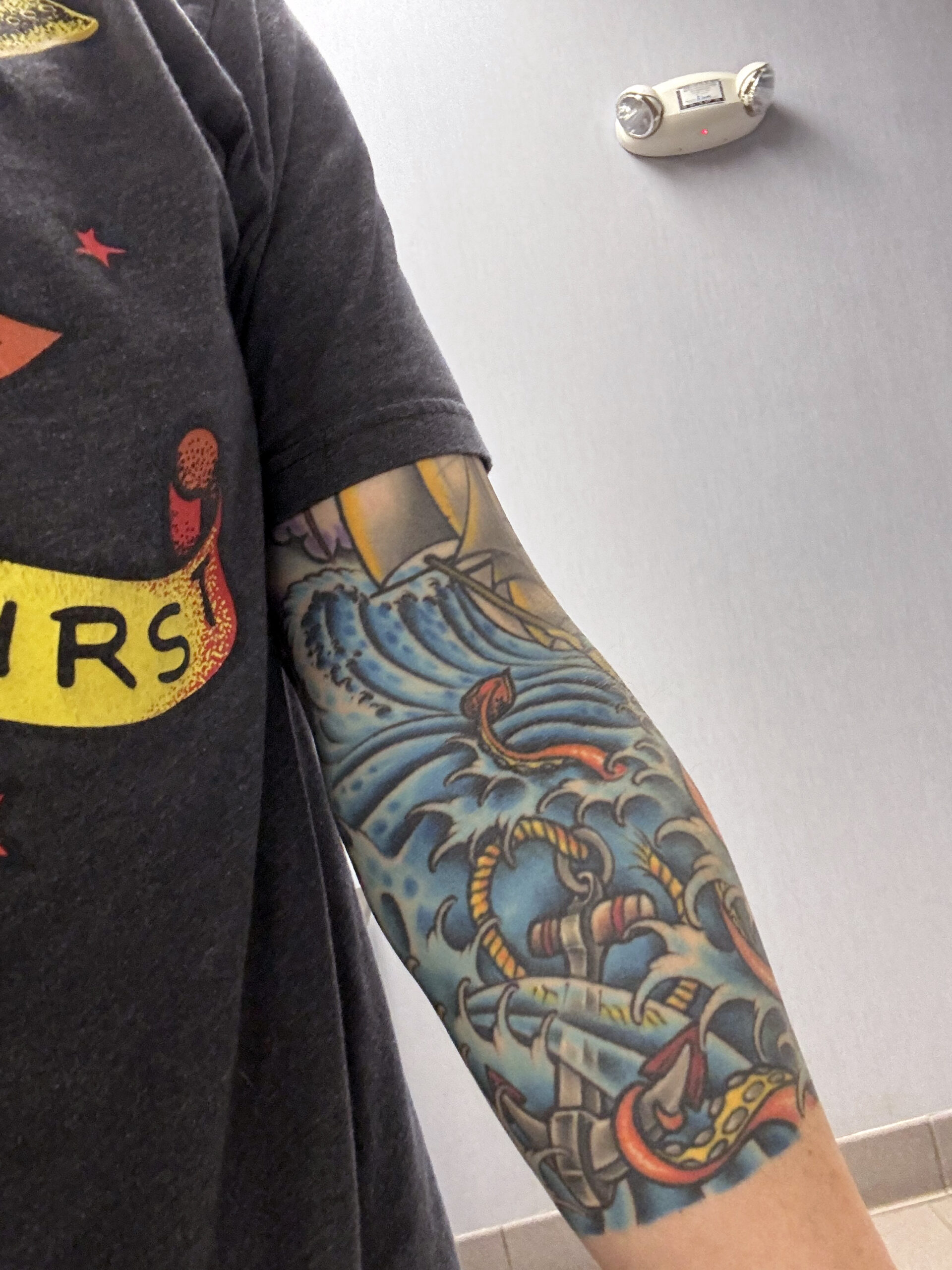 I started working on my left arm as my tattoo artist and I designed a 3/4 sleeve. My first piece was a ship based on Elissa, one of the oldest sailing ships out of Galveston (where I was born and raised). As part of the ship, I had a giant orange squid attacking the ship. The giant squid was a reminder of a classic film, 20,000 Leagues Under the Sea. A giant squid attacked the submarine in the movie, and although the movie was black and white, I always imagined the squid as orange. As Greg, my tattoo artist, built the waves on the lower 1/4 of my arm, I told him to leave space for an anchor. He tells me, “Well, we better do it now!” So he drew me an awesome anchor and rope.